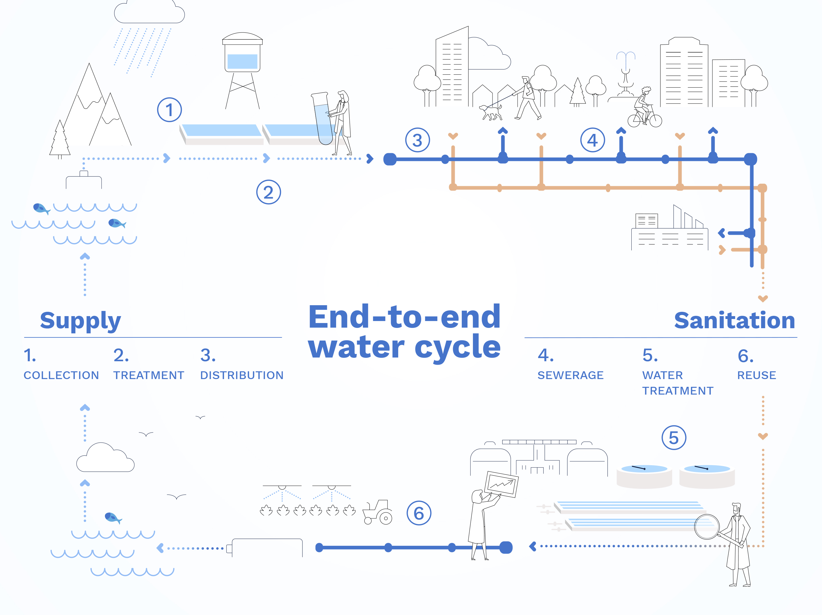 Our activity encompasses all stages of the water cycle: a thread that links together the entire value chain from collection and treatment, purification and reuse, to distribution, customer management, sewerage and infrastructure construction.